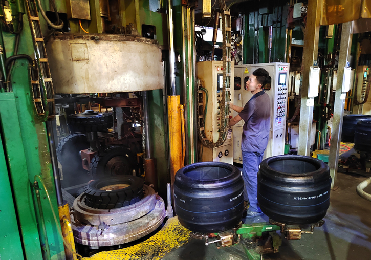 走進硫化車間,只見工人們正在認真操作著設(shè)備,對每個輪胎進行最后的加工處理?!傲蚧禽喬ドa(chǎn)的最后一道工序,對時間、溫度、壓力等指標(biāo)的把控至關(guān)重要?!辟F州輪胎前進特種胎分公司常務(wù)副總經(jīng)理王勇解釋道,經(jīng)過這道工序后,輪胎將正式成型,待通過公司嚴(yán)格的檢驗后便可銷往市場。
