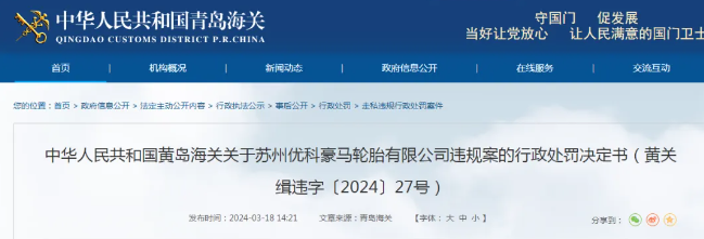 蘇州優(yōu)科豪馬輪胎遭海關(guān)行政處罰