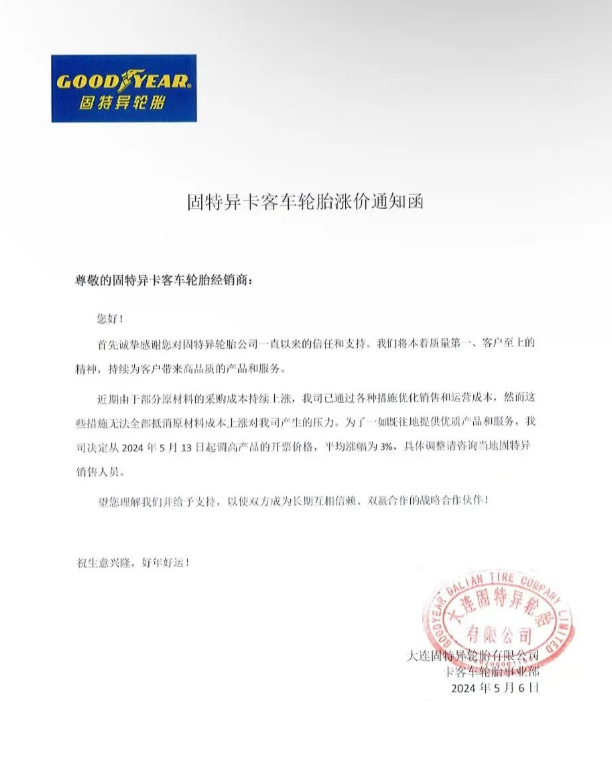 【炭黑產(chǎn)業(yè)網(wǎng)】5月9日消息,近日,輪胎制造巨頭固特異公司宣布,由于部分原材料采購成本的持續(xù)攀升,公司將在5月13日起對其產(chǎn)品進(jìn)行全面漲價,平均漲幅達(dá)到3%。這一決策是在公司經(jīng)過深思熟慮后作出的,目的在于抵消原材料成本上漲帶來的經(jīng)營壓力。在此之前,固特異已嘗試通過多種措施優(yōu)化銷售和運(yùn)營成本,但仍無法完全抵消成本壓力。