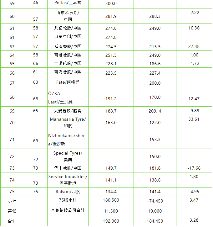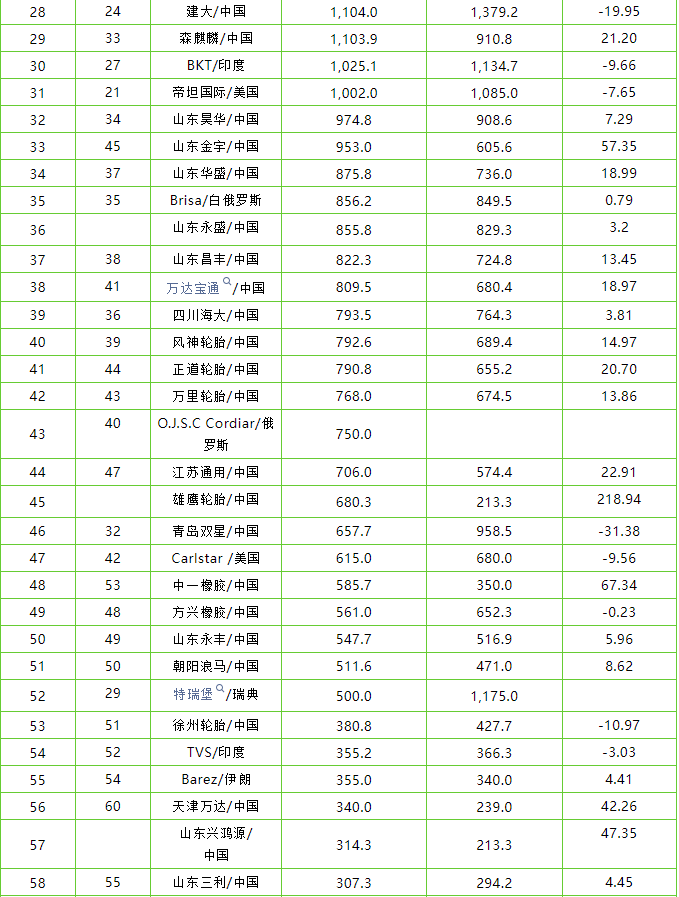 中國(guó)企業(yè)山東永盛橡膠、雄鷹輪胎和山東星宏源輪胎有限公司今年首次上榜。另外,第四家新公司是印度的Mahansaria Tyres公司,該公司首次亮相時(shí)排名第70,銷(xiāo)售額為1.63億美元。