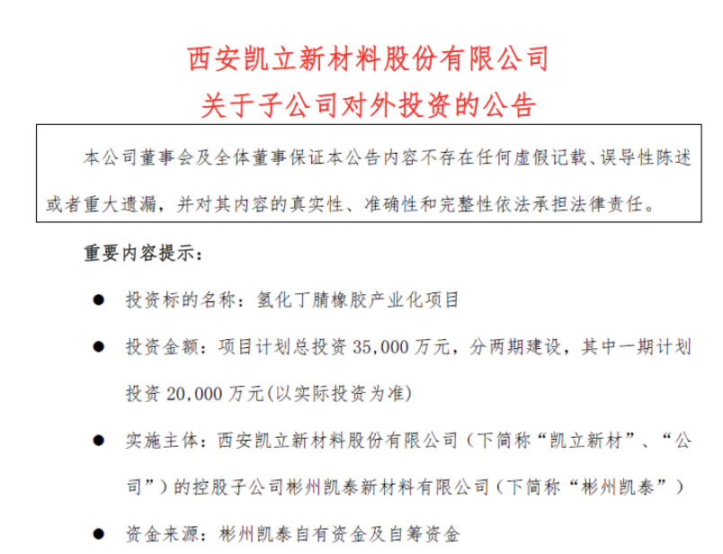 凱立新材子公司投3.5億建氫化丁腈橡膠項(xiàng)目