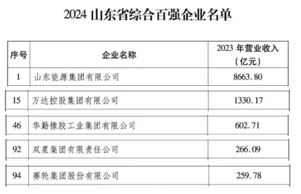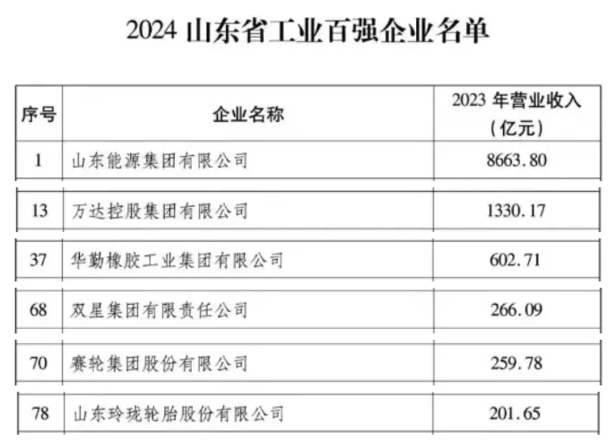 值得注意的是,輪胎行業(yè)在百強(qiáng)企業(yè)中占據(jù)了五個(gè)席位。其中,山東能源集團(tuán)以其卓越的業(yè)績位居榜首,成為全省百強(qiáng)企業(yè)的領(lǐng)頭羊,其旗下棗礦橡膠也備受矚目。與此同時(shí),萬達(dá)控股集團(tuán)憑借其去年1330.17億元的營收,成功躋身至第15位,其子公司萬達(dá)寶通輪胎在業(yè)內(nèi)同樣享有盛譽(yù)。此外,華勤橡膠、雙星集團(tuán)及賽輪集團(tuán)也分別位列第46位、第92位和第94位,展現(xiàn)了輪胎行業(yè)的整體實(shí)力。