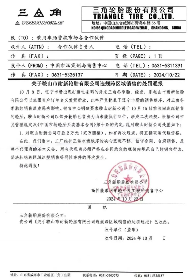 三角輪胎嚴(yán)懲違規(guī)銷售,鞍山耐新被罰2萬