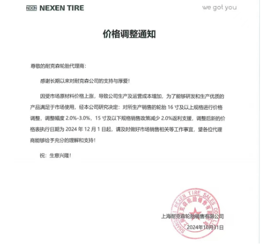 耐克森輪胎率先發(fā)布漲價通知,宣布自2024年12月1日起,對其16寸及以上規(guī)格的輪胎產(chǎn)品進(jìn)行價格調(diào)整,上調(diào)幅度為2.0%至3.0%,而15寸及以下規(guī)格的銷售政策則將減少2.0%的返利支援。