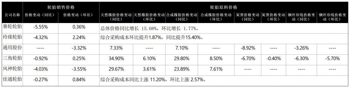 由此可見,輪胎企業(yè)的制造成本同比均呈現(xiàn)兩位數(shù)增長,其中天然橡膠和合成橡膠價格的大幅攀升是主要原因。盡管多家輪胎企業(yè)已嘗試通過提價來緩解成本壓力,但價格上漲的幅度并未能完全覆蓋成本的增長,導(dǎo)致企業(yè)的毛利率普遍下滑。