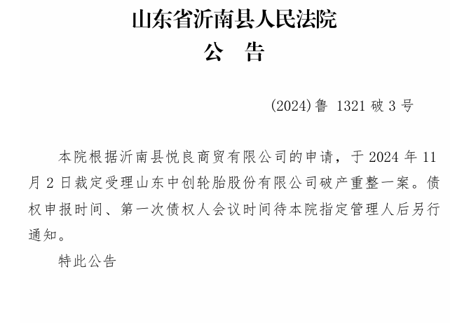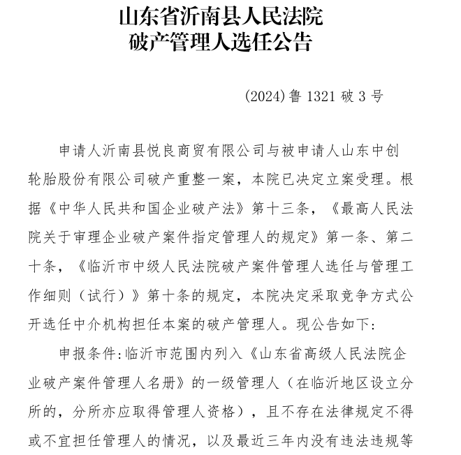 11月2日,山東省沂南縣人民法院對外發(fā)布了一則重要公告,宣布山東中創(chuàng)輪胎股份有限公司正式進入破產(chǎn)重整程序,并將通過公開選拔方式選任破產(chǎn)管理人,以促進該公司重整工作的順利進行。據(jù)了解,破產(chǎn)重整申請由沂南縣悅良商貿(mào)有限公司提出,理由是中創(chuàng)輪胎已無力償還到期債務(wù),且公司資產(chǎn)無法覆蓋全部債務(wù),盡管如此,公司仍具備重整的潛在價值。