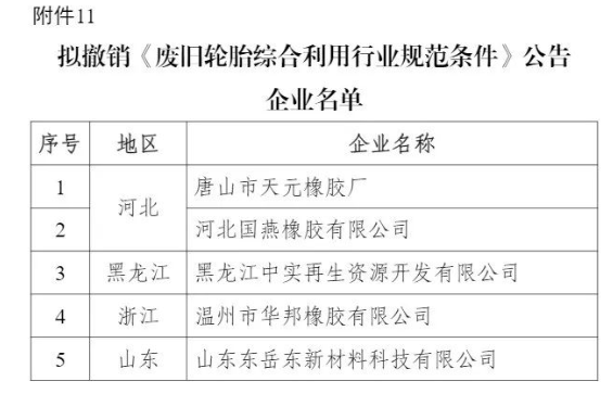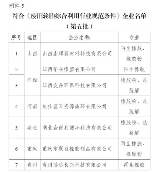 11月6日,工業(yè)和信息化部發(fā)布公告,對符合《廢舊輪胎綜合利用行業(yè)規(guī)范條件》企業(yè)名單(第五批),以及擬變更名稱、變更公告產(chǎn)能和撤銷的企業(yè)名單等進行公示,7家輪胎企業(yè)符合行業(yè)規(guī)范條件,具體如下: