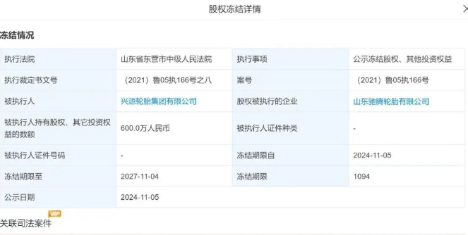 近日,山東省東營市中級(jí)人民法院對(duì)外發(fā)布了一則重要公告,涉及興源輪胎集團(tuán)有限公司(簡稱“興源輪胎”)的股權(quán)凍結(jié)情況。公告透露,興源輪胎在山東馳騰輪胎有限公司(簡稱“山東馳騰輪胎”)持有的60%股份,估值達(dá)600萬元人民幣,自2024年11月5日起至2027年11月4日,將處于法院凍結(jié)狀態(tài),為期三年,這一事件對(duì)公司的經(jīng)營權(quán)益產(chǎn)生了深遠(yuǎn)影響。