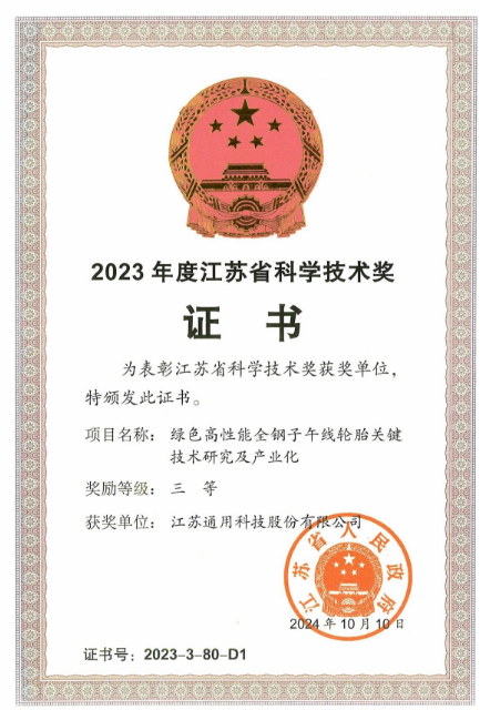 通用股份綠色輪胎技術(shù)摘得江蘇省科技獎(jiǎng)桂冠