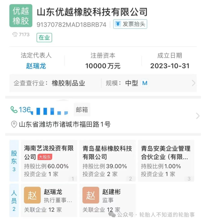 公司主要人員為趙瑞龍、趙建彬,據(jù)了解,趙建彬與趙瑞龍為父子關系,這一家族控股的模式在業(yè)內(nèi)較為常見。值得注意的是,趙建彬不僅是山東優(yōu)越的主要人員,同時也是山東優(yōu)盛輪胎有限公司(以下簡稱“優(yōu)盛輪胎”)的董事長和實控人,持股比例為80%。優(yōu)盛輪胎同樣位于濰坊,這表明山東優(yōu)越與優(yōu)盛輪胎之間可能存在著緊密的業(yè)務聯(lián)系或協(xié)同效應。