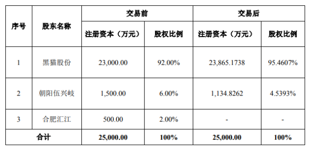交易前后朝陽黑貓的股權(quán)變化: