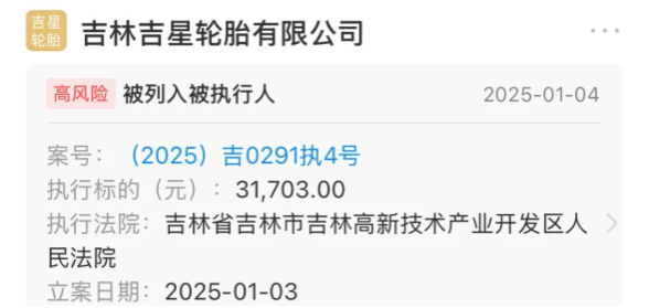 2025年1月4日,吉林吉星輪胎有限公司因涉及執(zhí)行標(biāo)的達(dá)31703元的案件,已被列入被執(zhí)行人高風(fēng)險(xiǎn)名單。