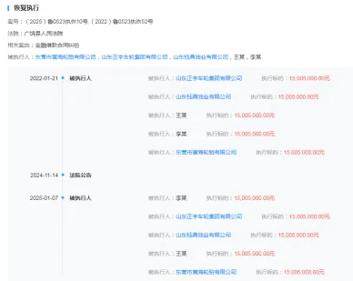 【炭黑產(chǎn)業(yè)網(wǎng)】1月13日消息,廣饒縣人民法院近日在東營市黃海輪胎有限公司(黃海輪胎)和山東正宇車輪集團有限公司(正宇車輪)與某銀行的金融借款合同糾紛案件中取得了新進展。根據(jù)天眼查APP數(shù)據(jù),案號為(2025)魯0523執(zhí)恢10號的案件于2025年1月7日被重新立案,執(zhí)行標的額達到15005000元人民幣。
