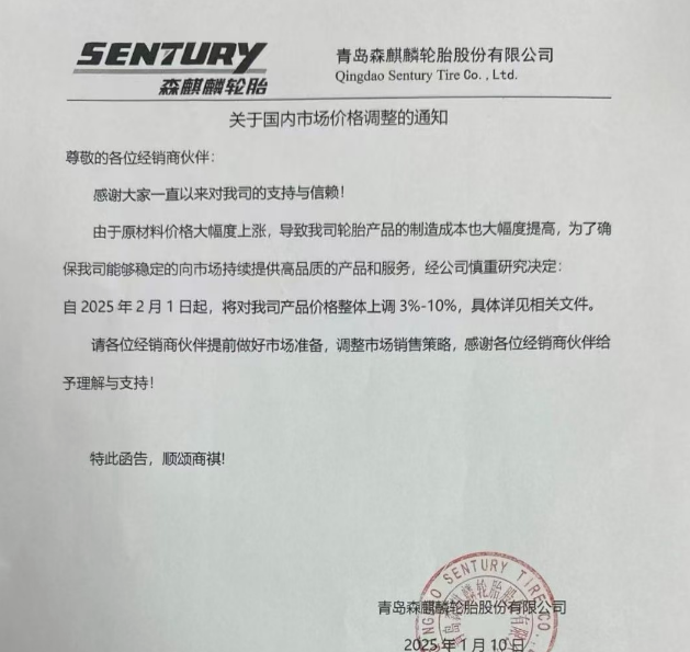 【炭黑產(chǎn)業(yè)網(wǎng)】1月13日消息,近日,青島森麒麟輪胎股份有限公司向其全國(guó)經(jīng)銷商發(fā)布了一則關(guān)于產(chǎn)品價(jià)格調(diào)整的通知。據(jù)了解,由于近期原材料價(jià)格的大幅上漲,該公司輪胎產(chǎn)品的生產(chǎn)成本也隨之顯著增加。為了保障公司能夠持續(xù)穩(wěn)定地向市場(chǎng)提供高品質(zhì)的產(chǎn)品和服務(wù),青島森麒麟輪胎股份有限公司經(jīng)過慎重考慮,決定自2025年2月1日起,對(duì)旗下輪胎產(chǎn)品的價(jià)格進(jìn)行全面上調(diào),調(diào)整幅度在3%至10%之間。