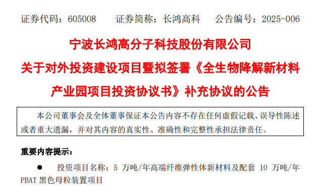 【炭黑產(chǎn)業(yè)網(wǎng)】1月16日消息,寧波長鴻高分子科技股份有限公司已與嵊州市人民政府簽署了《全生物降解新材料產(chǎn)業(yè)園項(xiàng)目投資協(xié)議書》的補(bǔ)充協(xié)議。根據(jù)協(xié)議,寧波長鴻高分子科技股份有限公司將在原有投資計(jì)劃的基礎(chǔ)上,新增建設(shè)年產(chǎn)5萬噸高端纖維彈性體新材料和年產(chǎn)10萬噸PBAT黑色母粒產(chǎn)線項(xiàng)目。