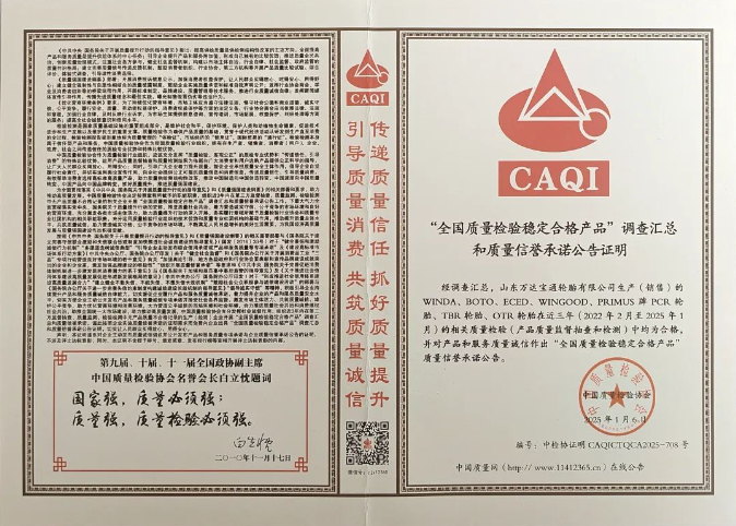 萬達寶通輪胎榮膺“全國質量檢驗穩(wěn)定合格產品”稱號