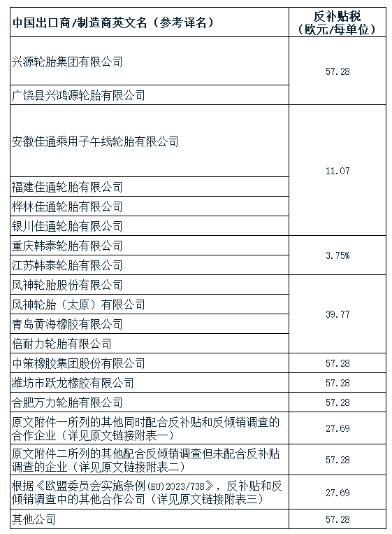 【炭黑產(chǎn)業(yè)網(wǎng)】1月23日消息,近日,歐盟委員會發(fā)布了一項重要公告,宣布對來自中國的全新及翻新卡客車輪胎的第一次反補貼日落復(fù)審作出了最終裁決。裁決結(jié)果維持了對中國相關(guān)產(chǎn)品的反補貼稅征收,稅率區(qū)間定為每單位3.75歐元至57.28歐元,具體稅率細節(jié)可參考相關(guān)表格。此次涉案產(chǎn)品的歐盟CN編碼為4011 20 90和4012 12 00(對應(yīng)的TARIC編碼為4012 12 00 10)。