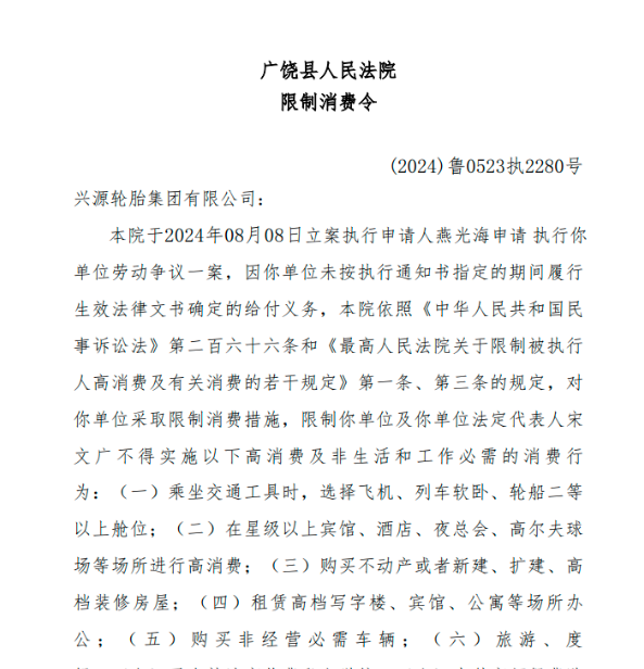 據(jù)了解,興源輪胎集團(tuán)有限公司未與承包單位、承租單位簽訂專門的安全生產(chǎn)管理協(xié)議,也未在承包合同、租賃合同中明確各自的安全生產(chǎn)管理職責(zé),同時(shí)未對(duì)承包單位、承租單位的安全生產(chǎn)進(jìn)行統(tǒng)一協(xié)調(diào)、管理。根據(jù)《中華人民共和國安全生產(chǎn)法》第四十九條第二款的規(guī)定,生產(chǎn)經(jīng)營單位應(yīng)當(dāng)與承包單位、承租單位簽訂專門的安全生產(chǎn)管理協(xié)議,或者在合同中明確各自的安全生產(chǎn)管理職責(zé)。興源輪胎集團(tuán)有限公司的違法行為屬于《中華人民共和國安全生產(chǎn)法》第一百零三條第二款所規(guī)定的處罰范疇,因此被處以10000元人民幣罰款。2024年12月,廣饒縣人民法院針對(duì)興源輪胎集團(tuán)有限公司(以下簡稱興源輪胎”)及其法定代表人宋文廣發(fā)布了限制消費(fèi)令,案號(hào)為(2024)魯0523執(zhí)2280號(hào)。