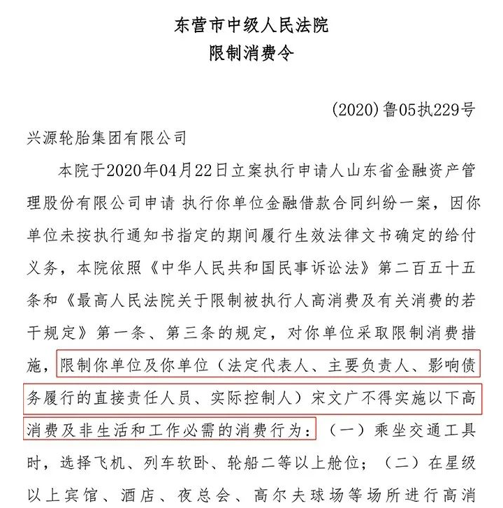 早在2020年4月27日,東營市中級(jí)人民法院發(fā)布了一條公告,2020年4月22日山東金融資產(chǎn)管理有限公司申請(qǐng)執(zhí)行星園集團(tuán)金融借款合同一案,興源集團(tuán)總經(jīng)理法定代表人被限制高消費(fèi)。包括乘坐交通工具、住酒店、購買樓房、租賃場(chǎng)所、子女讀私立高收費(fèi)學(xué)校等等。