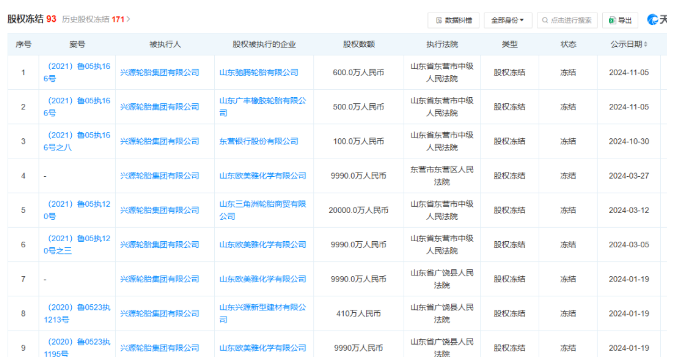 2024年11月6日,廣豐橡膠輪胎有限公司500萬人民幣被凍結(jié);2024年10月30日,東營銀行股份有限公司100萬人民幣被凍結(jié);2024年3月27日,山東歐美雅化學(xué)有限公司9990萬人民幣被凍結(jié)等等等等。