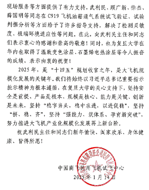 喜報丨為大飛機試飛驗證成功做出重要貢獻,復(fù)旦大學(xué)武利民團隊收到感謝信