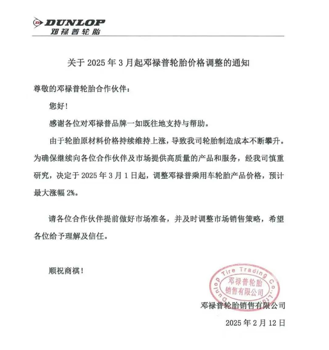 【炭黑產(chǎn)業(yè)網(wǎng)】2月13日消息,近日,鄧祿普輪胎銷售有限公司宣布了一項(xiàng)重要決策,將自2025年3月1日起對(duì)其乘用車輪胎產(chǎn)品進(jìn)行價(jià)格調(diào)整。這一決定背后,是輪胎原材料價(jià)格持續(xù)上漲所帶來的制造成本壓力。