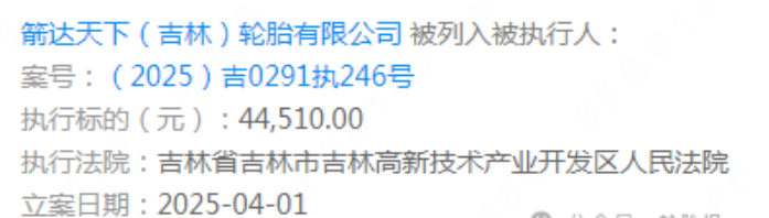 近日,吉林省吉林市吉林高新技術(shù)產(chǎn)業(yè)開發(fā)區(qū)人民法院發(fā)布了一則執(zhí)行信息,箭達天下(吉林)輪胎有限公司因涉案金額44510元被列入被執(zhí)行人名單。這一消息引發(fā)了業(yè)內(nèi)對該公司正在推進的年產(chǎn)1500萬條新能源汽車輪胎項目的關(guān)注。