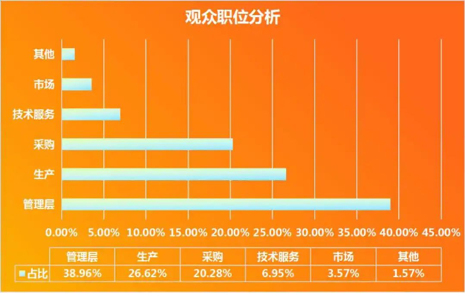 在參觀觀眾的構(gòu)成中,各職業(yè)群體占比情況如下:管理人員占比38.96%,生產(chǎn)人員占比26.62%,采購人員占比20.28%,技術(shù)服務(wù)人員占比6.95%,市場人員占比3.57%。