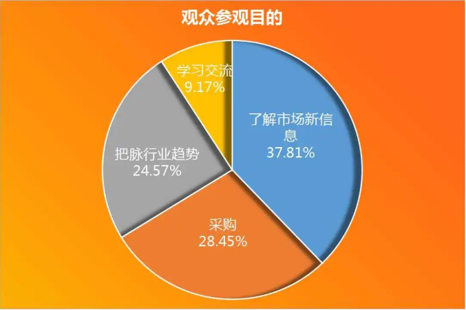 據(jù)統(tǒng)計,專業(yè)觀眾參與展會的主要目的呈現(xiàn)多樣化分布:其中,約37.8%的專業(yè)觀眾是為了深入了解市場信息而來;約28.5%的專業(yè)觀眾主要目的是進行商品采購;此外,約24.6%的專業(yè)觀眾則是為了精準把脈行業(yè)發(fā)展趨勢。