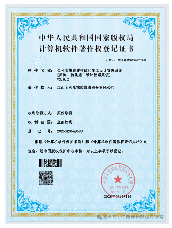 【炭黑產(chǎn)業(yè)網(wǎng)】4月12日消息,江西金利隆橡膠履帶股份有限公司近日迎來喜訊,其自主研發(fā)的《硫化施工設(shè)計管理系統(tǒng)V3.6.2》成功獲得國家版權(quán)局頒發(fā)的計算機軟件著作權(quán)登記證書。這一創(chuàng)新成果由公司技術(shù)研發(fā)中心的產(chǎn)品設(shè)計專家吳龍飛領(lǐng)銜開發(fā),標志著金利隆在橡膠履帶硫化施工設(shè)計領(lǐng)域邁出了堅實的一步。