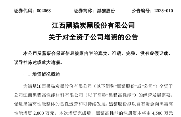 此次增資規(guī)模達(dá) 2000 萬元,增資完成后,黑貓高性能的注冊資本將從原有的 4500 萬元提升至 6500 萬元,公司仍將保持對該子公司的全資控股地位。