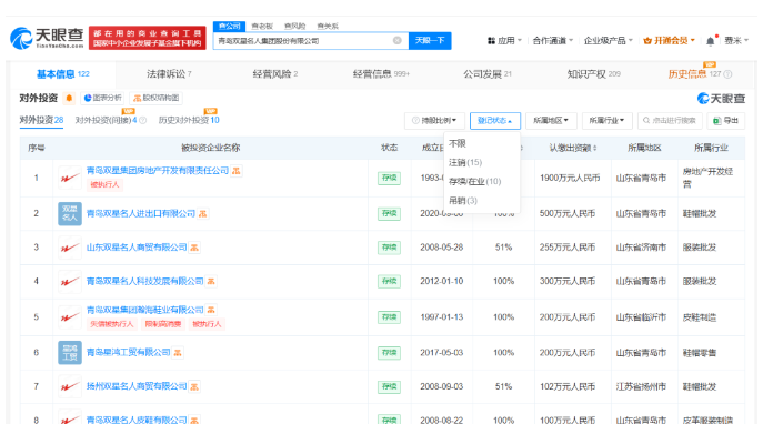 據(jù)炭黑產(chǎn)業(yè)網(wǎng)了解,青島雙星名人集團(tuán)股份有限公司成立于 2002 年 9 月,法定代表人為汪海,注冊資本約 1.01 億人民幣,業(yè)務(wù)涵蓋橡膠制品制造、勞保鞋及勞動保護(hù)用品的生產(chǎn)銷售、自有資金對外投資等領(lǐng)域,由青島星邁達(dá)工貿(mào)有限公司、汪海、山東王道商貿(mào)有限公司等共同持股。從對外投資信息來看,該公司對外投資 28 家企業(yè),其中 18 家處于注銷或吊銷狀態(tài),僅 10 家為存續(xù)或開業(yè)狀態(tài),像青島雙星集團(tuán)房地產(chǎn)開發(fā)有限責(zé)任公司、青島雙星名人進(jìn)出口有限公司等便在開業(yè)之列。而汪海關(guān)聯(lián)企業(yè)共有 8 家,其中 5 家已注銷或吊銷,剩余 3 家為開業(yè)狀態(tài),包括青島雙星名人集團(tuán)股份有限公司、青島雙星名人進(jìn)出口有限公司、青島名人海工貿(mào)有限公司 。