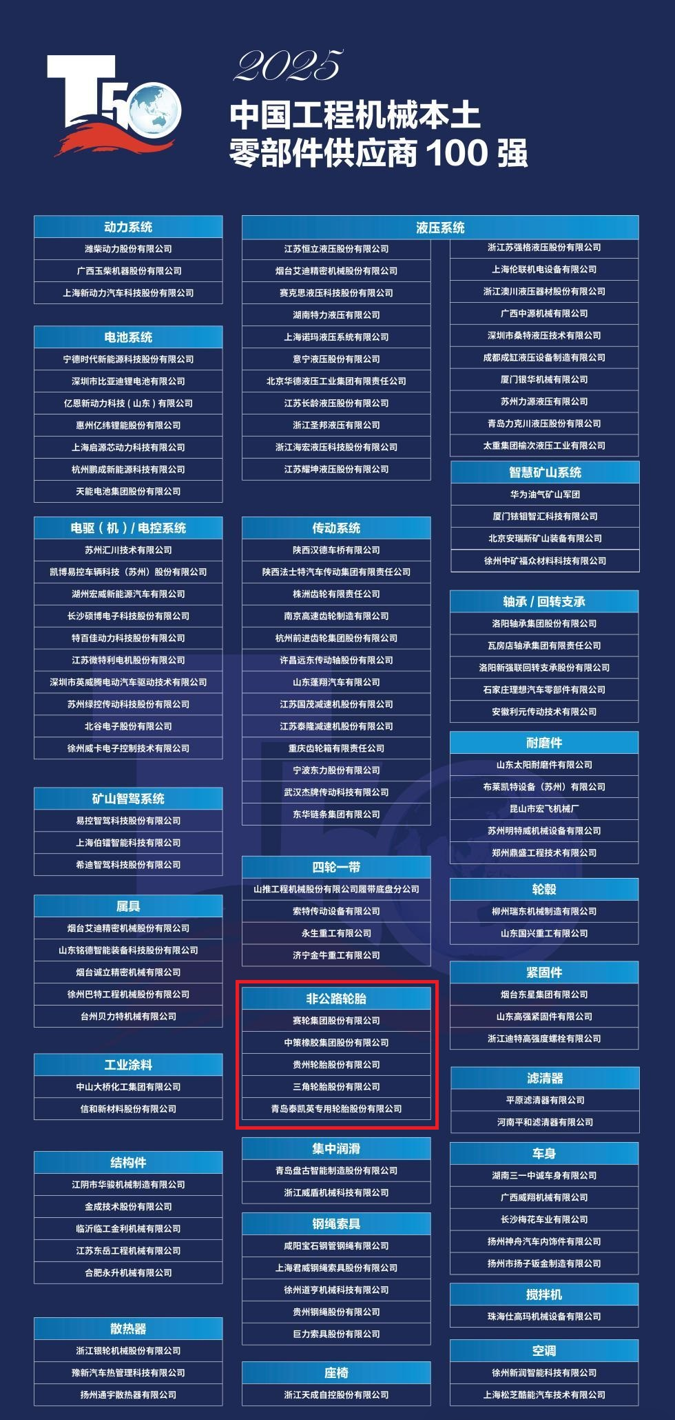 【炭黑產(chǎn)業(yè)網(wǎng)】5月26日消息,近日,在湖南長沙舉辦的"2025全球工程機械50強峰會"上,一份備受矚目的榜單——"2025全球工程機械零部件供應(yīng)商100強"正式揭曉。中國輪胎行業(yè)迎來高光時刻,賽輪、貴州輪胎、泰凱英三家企業(yè)憑借卓越實力成功登榜,彰顯了中國輪胎企業(yè)在全球工程機械配套領(lǐng)域的強勁競爭力。