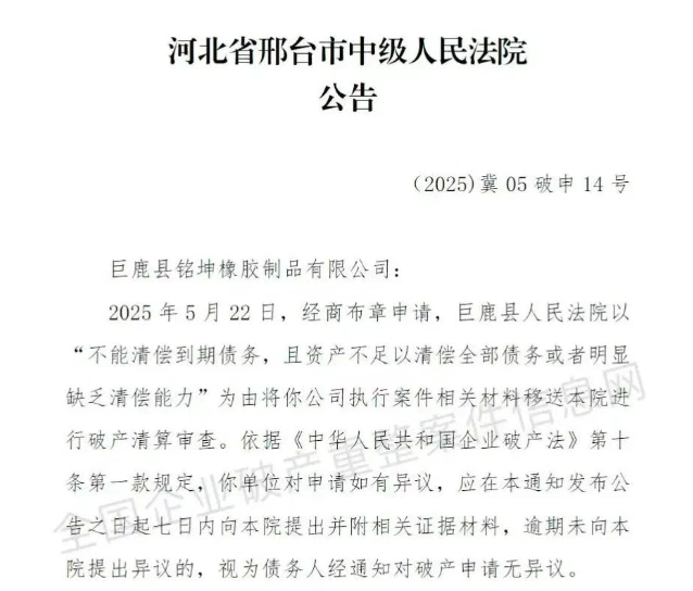 【炭黑產(chǎn)業(yè)網(wǎng)】6月6日消息,近日,巨鹿縣銘坤橡膠制品有限公司陷入財務困境,其破產(chǎn)清算審查程序已正式啟動。這一消息引發(fā)了行業(yè)內(nèi)的廣泛關(guān)注,畢竟該公司曾是當?shù)剌喬ブ圃祛I域的一員。