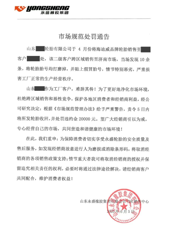 近日,永盛橡膠集團(tuán)TBR銷售中心發(fā)布市場規(guī)范處罰通告,對山東某輪胎公司磨換胎號(hào)、跨區(qū)域銷售等行為嚴(yán)重警告,責(zé)令其5日內(nèi)收回跨區(qū)域銷售輪胎,并處罰違約金20000元。