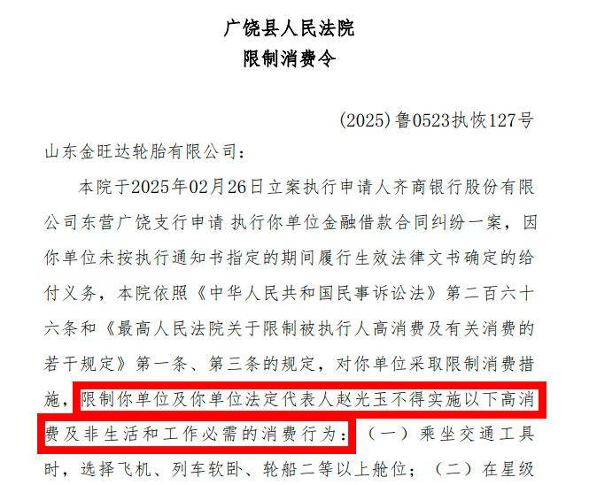 法院限制消費(fèi)令顯示,2024年7月2日立案執(zhí)行申請(qǐng)人公彥紅申請(qǐng)執(zhí)行山東中創(chuàng)輪胎股份有限公司勞動(dòng)合同糾紛一案。因山東中創(chuàng)輪胎股份有限公司未按執(zhí)行通知書(shū)指定的期間履行生效法律文書(shū)確定的給付義務(wù),沂南縣人民法院依照《中華人民共和國(guó)民事訴訟法》第二百六十六條和《最高人民法院關(guān)于限制被執(zhí)行人高消費(fèi)及有關(guān)消費(fèi)的若干規(guī)定》第一條、第三條的規(guī)定,對(duì)山東中創(chuàng)輪胎股份有限公司采取限制消費(fèi)措施,限制山東中創(chuàng)輪胎股份有限公司及山東中創(chuàng)輪胎股份有限公司法定代表人成秀林不得實(shí)施以下高消費(fèi)及非生活和工作必需的消費(fèi)行為。