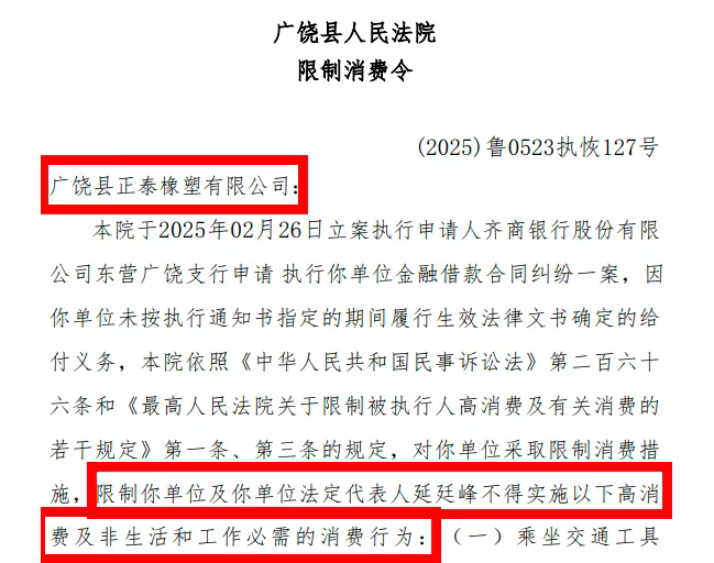 廣饒縣人民法院對(duì)廣饒縣正泰橡塑有限公司及其法定代表人延廷峰也采取了限制高消費(fèi)措施。
