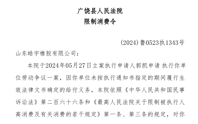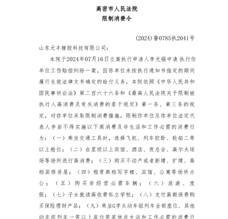 法院限制消費(fèi)令顯示,2024年7月16日立案執(zhí)行申請(qǐng)人李光強(qiáng)申請(qǐng)執(zhí)行山東元豐橡膠科技有限公司工傷賠償糾紛一案。因山東元豐橡膠科技有限公司未按執(zhí)行通知書(shū)指定的期間履行生效法律文書(shū)確定的給付義務(wù),高密市人民法院依照《中華人民共和國(guó)民事訴訟法》第二百六十六條和《最高人民法院關(guān)于限制被執(zhí)行人高消費(fèi)及有關(guān)消費(fèi)的若干規(guī)定》第一條、第三條的規(guī)定,對(duì)山東元豐橡膠科技有限公司采取限制消費(fèi)措施,限制山東元豐橡膠科技有限公司及山東元豐橡膠科技有限公司法定代表人李巖不得實(shí)施高消費(fèi)及非生活和工作必需的消費(fèi)行為。