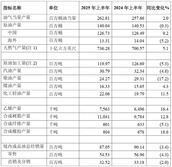 7月24日,中國石化(600028/00386)發(fā)布公告,2025年上半年生產(chǎn)經(jīng)營業(yè)績提示性數(shù)據(jù)。根據(jù)公告,油氣當(dāng)量產(chǎn)量為262.81百萬桶油當(dāng)量,同比增長2.0%。原油加工量119.97百萬噸,同比下降5.3%;乙烯產(chǎn)量7563千噸,同比增長16.4%;合成樹脂產(chǎn)量1.1萬噸,同比增長12.8%;合成纖維產(chǎn)量601千噸,同比下降5.1%;合成橡膠產(chǎn)量804千噸,同比增長18.6%;境內(nèi)成品油總經(jīng)銷量87.05百萬噸,同比下降3.4%。