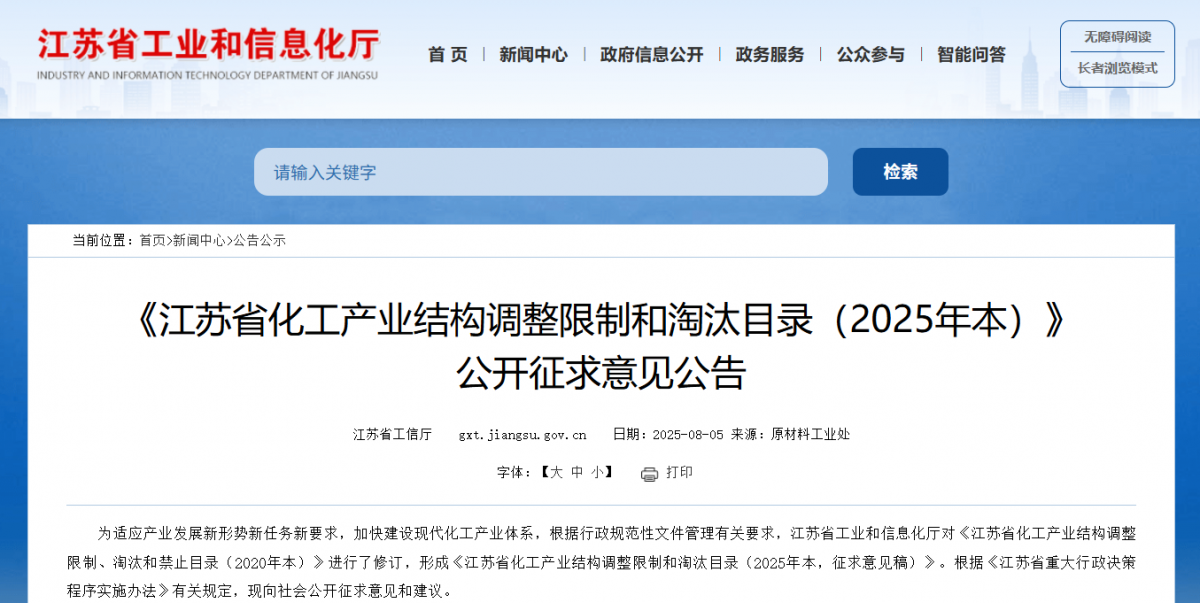 【炭黑產(chǎn)業(yè)網(wǎng)】8月7日消息,8月5日,江蘇省工業(yè)和信息化廳發(fā)布《江蘇省化工產(chǎn)業(yè)結(jié)構(gòu)調(diào)整限制和淘汰目錄(2025年本)》公開(kāi)征求意見(jiàn)公告,其中: