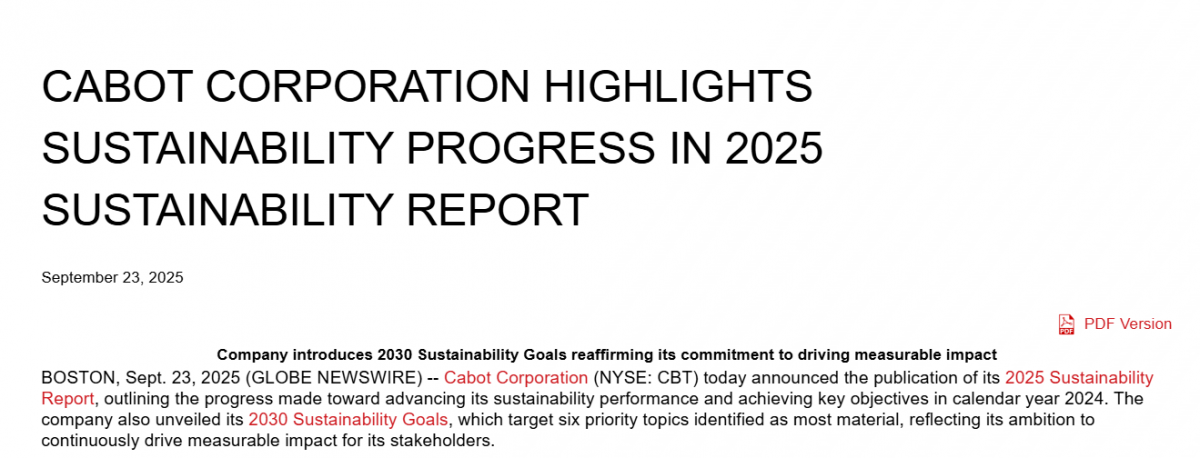 【炭黑產(chǎn)業(yè)網(wǎng)】9 月 25 日消息,卡博特公司(紐約證券交易所代碼:CBT)于 2025 年 9 月 23 日在波士頓發(fā)布《2025 年可持續(xù)發(fā)展報(bào)告》,披露 2024 年可持續(xù)發(fā)展績(jī)效及關(guān)鍵目標(biāo)進(jìn)展,同步公布 2030 年可持續(xù)發(fā)展目標(biāo)。
