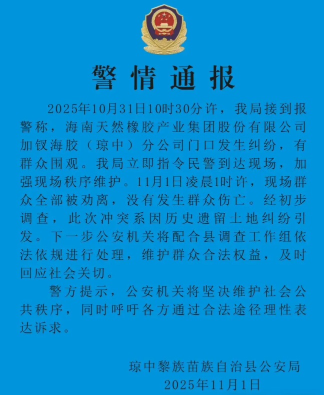 10月31日10時(shí)30分許,瓊中縣公安局接到報(bào)警稱(chēng),海南天然橡膠產(chǎn)業(yè)集團(tuán)股份有限公司加釵海膠(瓊中)分公司門(mén)口發(fā)生糾紛,有群眾圍觀。公安機(jī)關(guān)立即指令民警抵達(dá)現(xiàn)場(chǎng),加強(qiáng)秩序維護(hù)工作。至11月1日凌晨1時(shí)許,現(xiàn)場(chǎng)群眾已全部被勸離,事件中未造成群眾傷亡。經(jīng)初步調(diào)查,此次沖突系歷史遺留土地糾紛引發(fā)。
