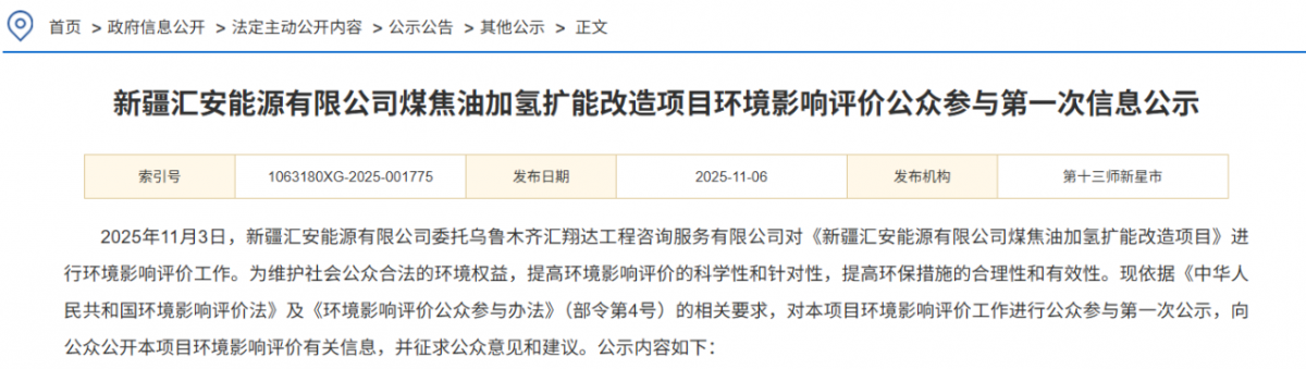 11月6日,新疆匯安能源有限公司煤焦油加氫擴(kuò)能改造項(xiàng)目環(huán)境影響評(píng)價(jià)公眾參與第一次信息公示。