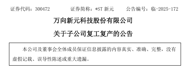 2024 年 12 月 4 日,萬向新元率先發(fā)布《關(guān)于子公司臨時停產(chǎn)的提示性公告》,稱經(jīng)審慎評估,為實(shí)現(xiàn)成本管控、提升生產(chǎn)效率及保障股東權(quán)益,決定讓全資子公司萬向新元(寧夏)智能環(huán)保科技有限公司(下稱 “寧夏新元”)進(jìn)入臨時停產(chǎn)階段。