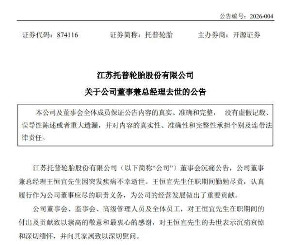 【炭黑產(chǎn)業(yè)網(wǎng)】2月27日消息,2月25日,江蘇托普輪胎股份有限公司(證券代碼:874116)對(duì)外發(fā)布了一則令人痛心的公告,公司董事兼總經(jīng)理王恒宜先生因突發(fā)疾病,雖經(jīng)全力搶救,仍不幸離世。