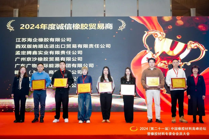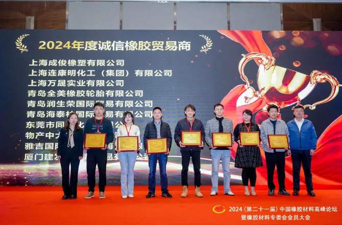 中國橡膠工業(yè)協(xié)會橡膠材料專委會秘書長王小芳、合盛天然橡膠(上海)有限公司總經(jīng)理王學(xué)峰、雙錢輪胎集團有限公司安環(huán)運營部總監(jiān)何穎,分別主持各時段的會議。會上頒發(fā)了2024年度“誠信橡膠產(chǎn)業(yè)服務(wù)商”、“誠信橡膠貿(mào)易商”證書,中國橡膠工業(yè)協(xié)會副秘書長、輪胎分會秘書長史一鋒,海南天然橡膠產(chǎn)業(yè)集團股份有限公司黨委副書記、總經(jīng)理楊宇,中國橡膠工業(yè)協(xié)會橡膠材料專業(yè)委員會顧問侯鳳霞分別為獲選單位頒發(fā)證書。