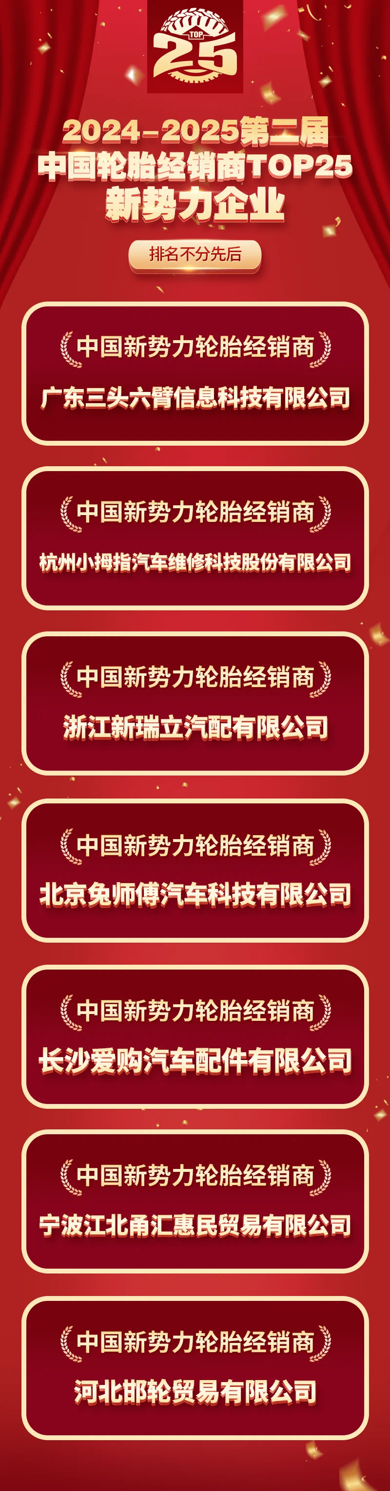 李發(fā)榮代表第二屆中國輪胎經(jīng)銷商TOP25評審委員會公布榜單該榜單經(jīng)行業(yè)權(quán)威機構(gòu)推薦、實地走訪調(diào)研,依據(jù)合法守規(guī)、誠信經(jīng)營、年銷規(guī)模、創(chuàng)新突破等多維評審篩選,產(chǎn)生2024-2025年度“中國輪胎經(jīng)銷商TOP25”、“中國優(yōu)秀輪胎經(jīng)銷商”以及“中國新勢力輪胎經(jīng)銷商”企業(yè)共39家,經(jīng)前期公示得到全行業(yè)的一致認(rèn)可。