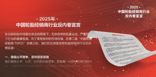 在當(dāng)前輪胎市場復(fù)雜多變的局勢下,無序競爭的亂象叢生,嚴(yán)重?fù)p害了行業(yè)的健康發(fā)展。為了重塑良好的市場環(huán)境,在第二屆“中國輪胎經(jīng)銷商TOP25”慶典之際,我們在此鄭重發(fā)布輪胎經(jīng)銷商行業(yè)反內(nèi)卷宣言: