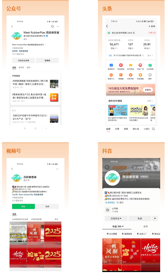 繼2024重慶、成都橡塑展成功召開,為更好地保障展會(huì)效果,2025年,我們將繼續(xù)加大宣傳力度,搭建自營宣傳矩陣、構(gòu)建展會(huì)營銷體系、鋪設(shè)線上線下廣告、深入中西部橡塑市場地推,全媒體、多方位、深層次的飽和式宣傳推廣,我們的宗旨是確保參與展會(huì)的每一位展商和客商盡興而來,滿載而歸。