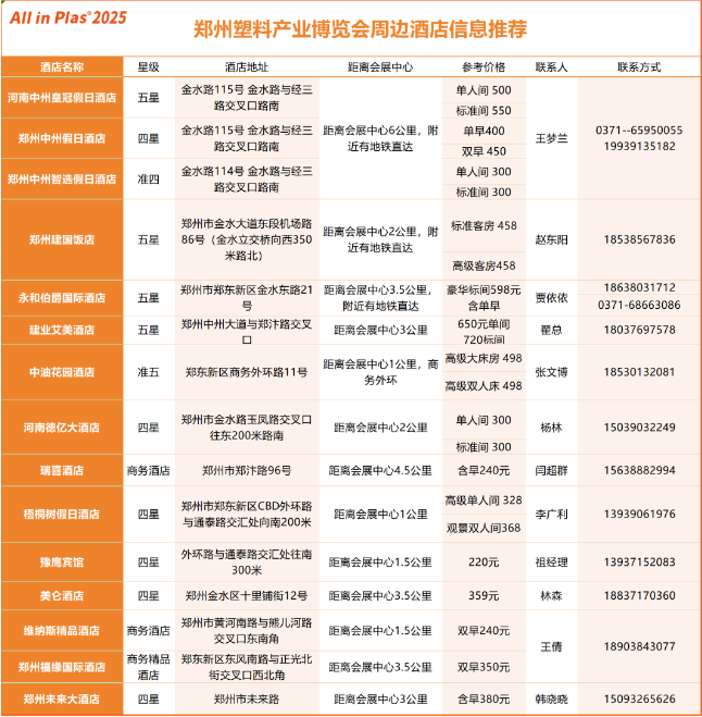 AllinPlas2025鄭州塑博會,3月2-4日,將在鄭州國際會展中心盛大開幕!展會為期3天,展覽面積近5萬平方米,下面附上一份詳細的「參觀指南」,包括部分展商名錄、展會時間、入場方式交通信息、住宿信息等建議大家收藏以便隨時查看!